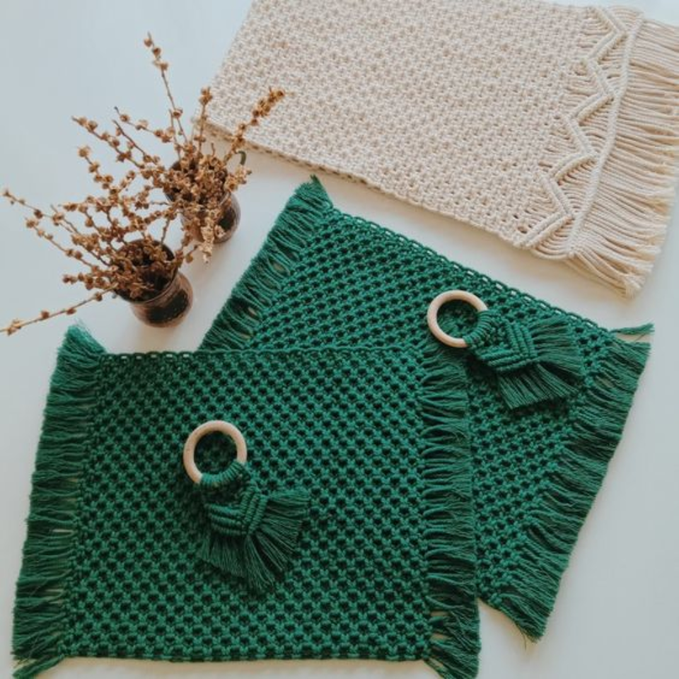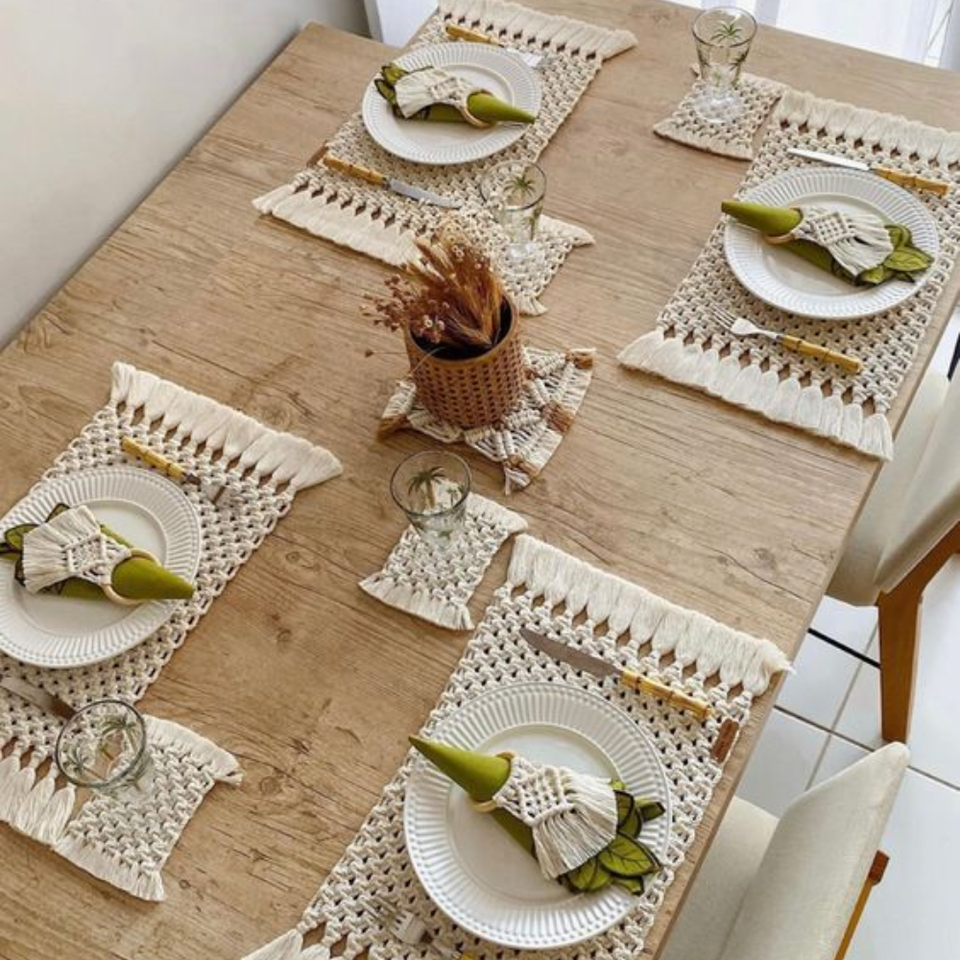 ชุดแผ่นรองจานมาคราเม่แสนสบาย 4 ชิ้น สไตล์โบโฮ พร้อมแผ่นรองแก้วสีดำ สำหรับตกแต่งโต๊ะอาหารในงานปาร์ตี้ ขายส่งจากเวียดนาม
