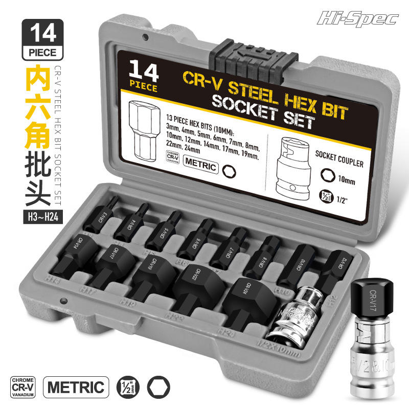 ชุดบิตหกเหลี่ยมเหล็ก Cr-V 14 ชิ้น เมตริก 3-24 มม. พร้อมข้อต่อ 10 มม.