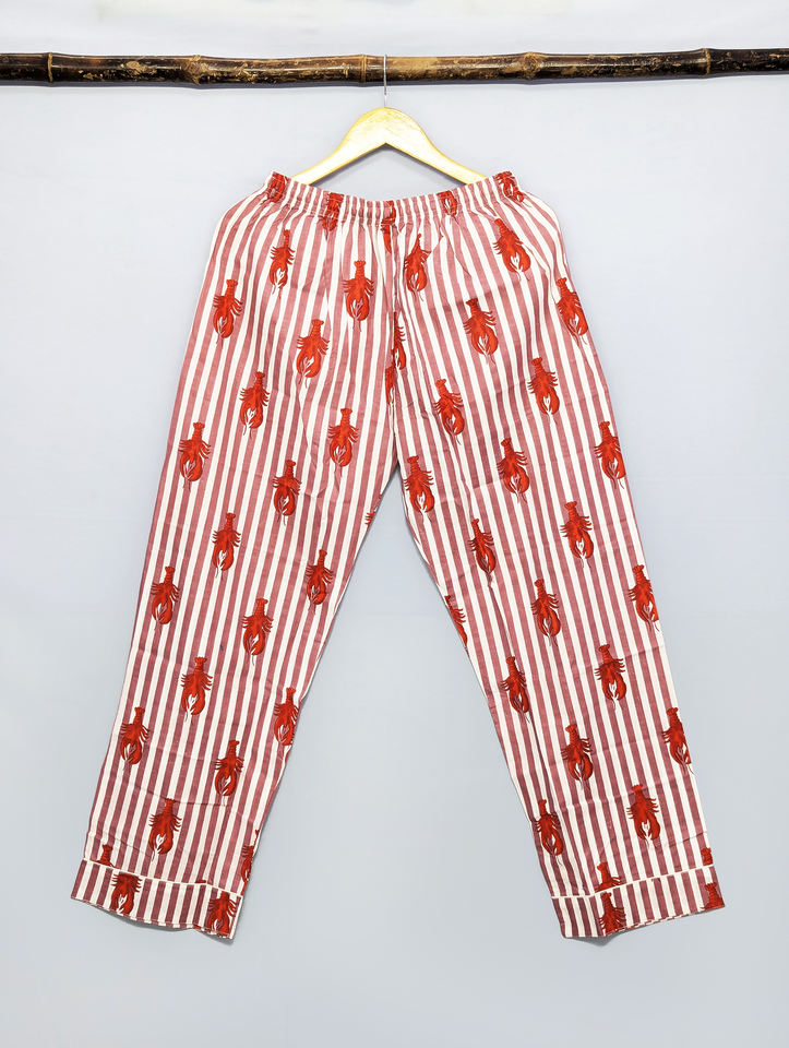 ชุดนอนลายปูพิมพ์ลายทาง ผ้าฝ้ายแท้ พิมพ์ลายด้วยมือ เสื้อแขนยาว กางเกงขายาว ชุดนอนผู้หญิง ชุดลำลอง ชุดนอนลายทางทะเล