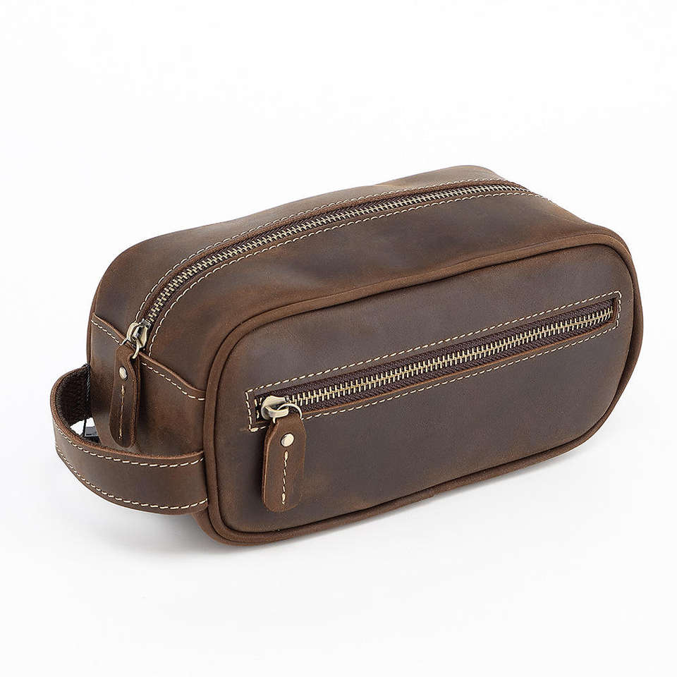 กระเป๋าเครื่องสำอางหนังแท้ Crazy Horse สำหรับนักเดินทาง กระเป๋าใส่ลิปสติกและเครื่องสำอางสำหรับเดินทาง กระเป๋าหนังฟูลเกรนสำหรับใส่ของใช้ในห้องน้ำ