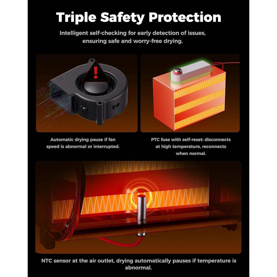 กล่องเก็บและอบเส้นพลาสติกสำหรับเครื่องพิมพ์สามมิติ Creality X4 แบบอุ่นแยกอิสระ รองรับ Space Pi ความร้อนสูงสุด 85 องศาเซลเซียส จุได้ 4 ม้วน สีดำ