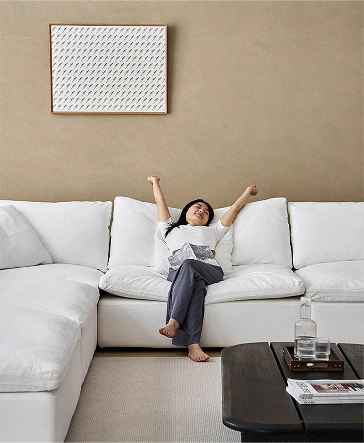 โซฟาผ้าสีครีม ผ้าฝ้ายผสมป่าน เรียบง่าย สำหรับห้องนั่งเล่น อพาร์ทเมนต์ทันสมัย ห้างสรรพสินค้า โรงเรียน โซฟาทรงบล็อก/ทรงเมฆ