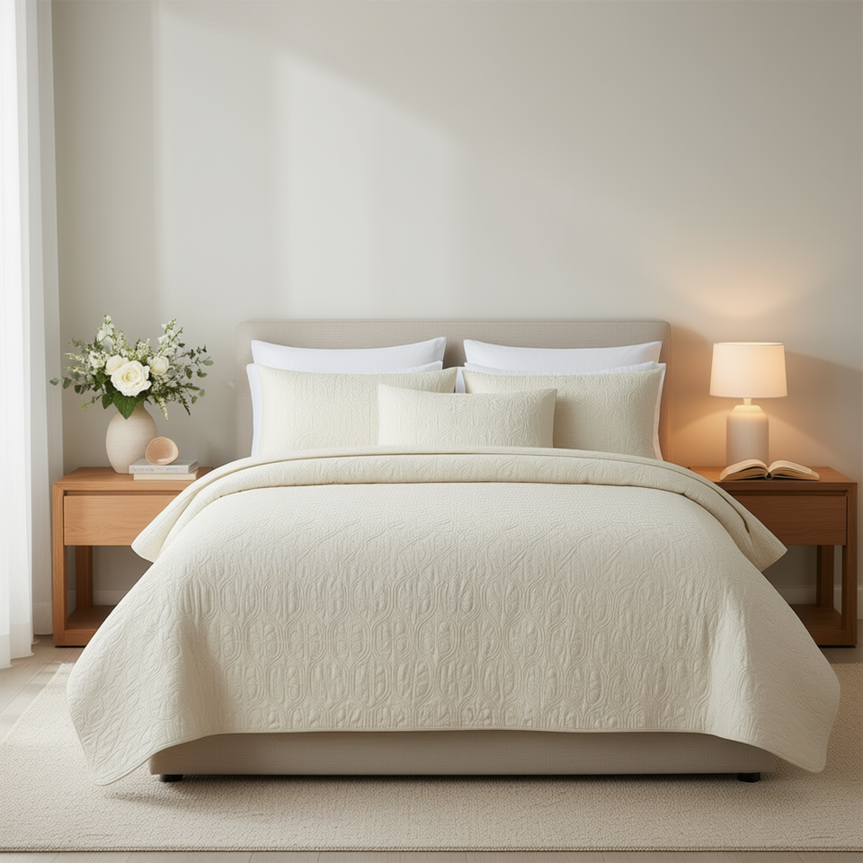 ชุดผ้าคลุมเตียงครีมคิงไซส์ 3 ชิ้น แบบเย็บติดกัน ผ้าคลุมเตียงโพลีเอสเตอร์ซักได้ ดีไซน์หรูหรา ลายเรียบ