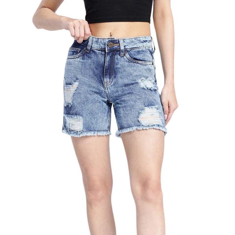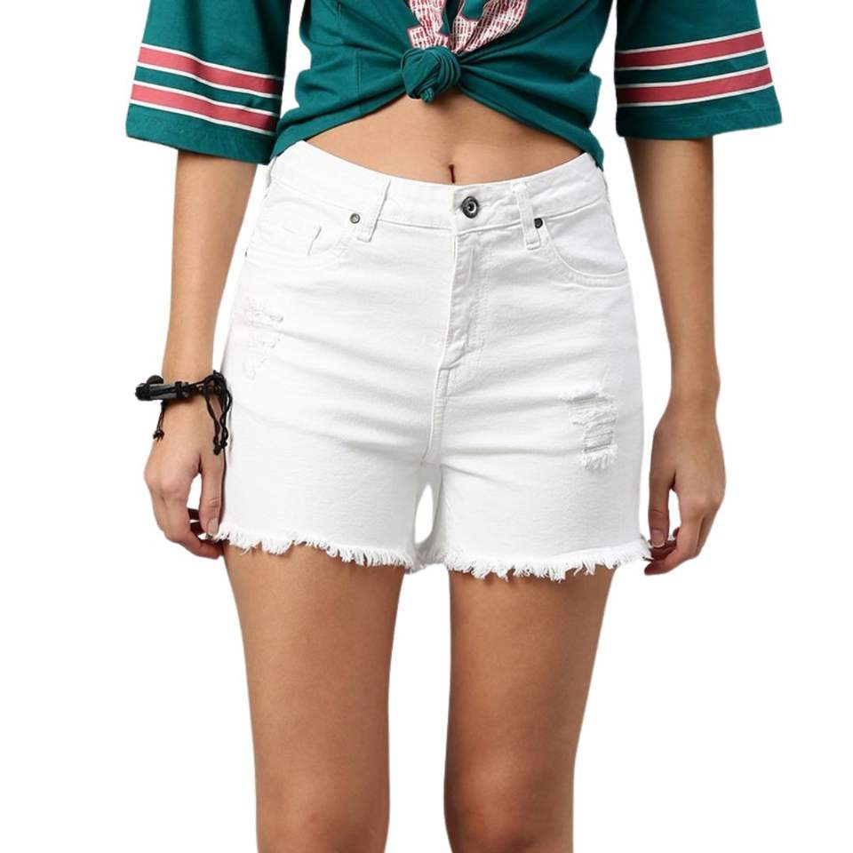 กางเกงยีนส์ขาสั้นทรงตรงเอวสูงผ้าเดนิมสีครีมสำหรับผู้หญิงแฟชั่นฤดูร้อน