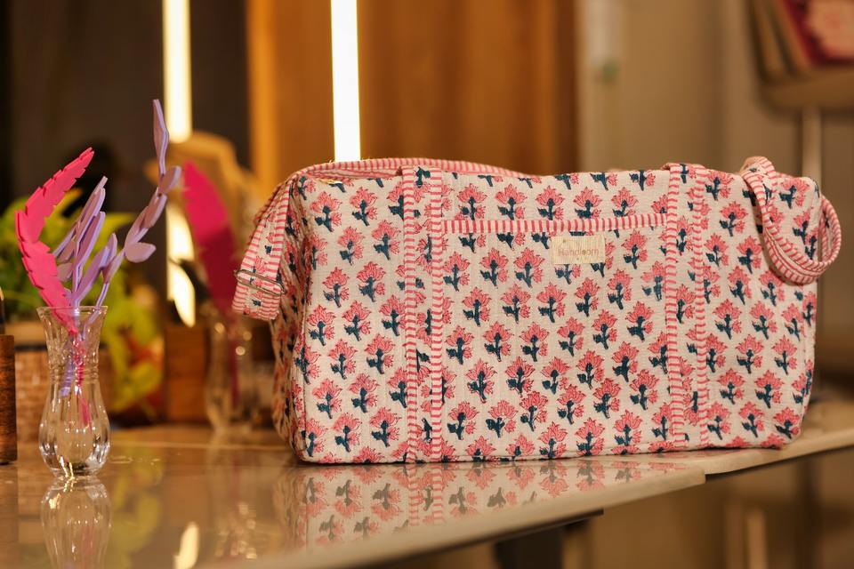 กระเป๋าดัฟเฟิลบล็อกมือผ้าฝ้ายพิมพ์ลายดอกไม้สีครีมสีชมพูกระเป๋าโท้ทสำหรับเดินทางทำด้วยมือสำหรับผู้หญิงกระเป๋าที่เป็นมิตรต่อสิ่งแวดล้อมแบบอินเดีย