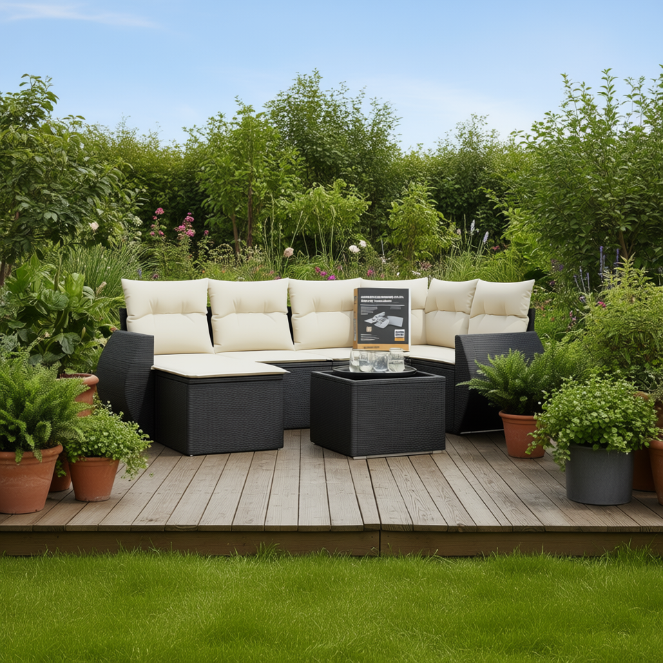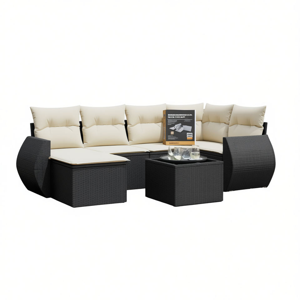 ชุดโซฟาหวายสีขาวครีมและดำ พร้อมเบาะรองนั่ง 6 ที่นั่ง เฟอร์นิเจอร์กลางแจ้ง ดีไซน์ร่วมสมัย