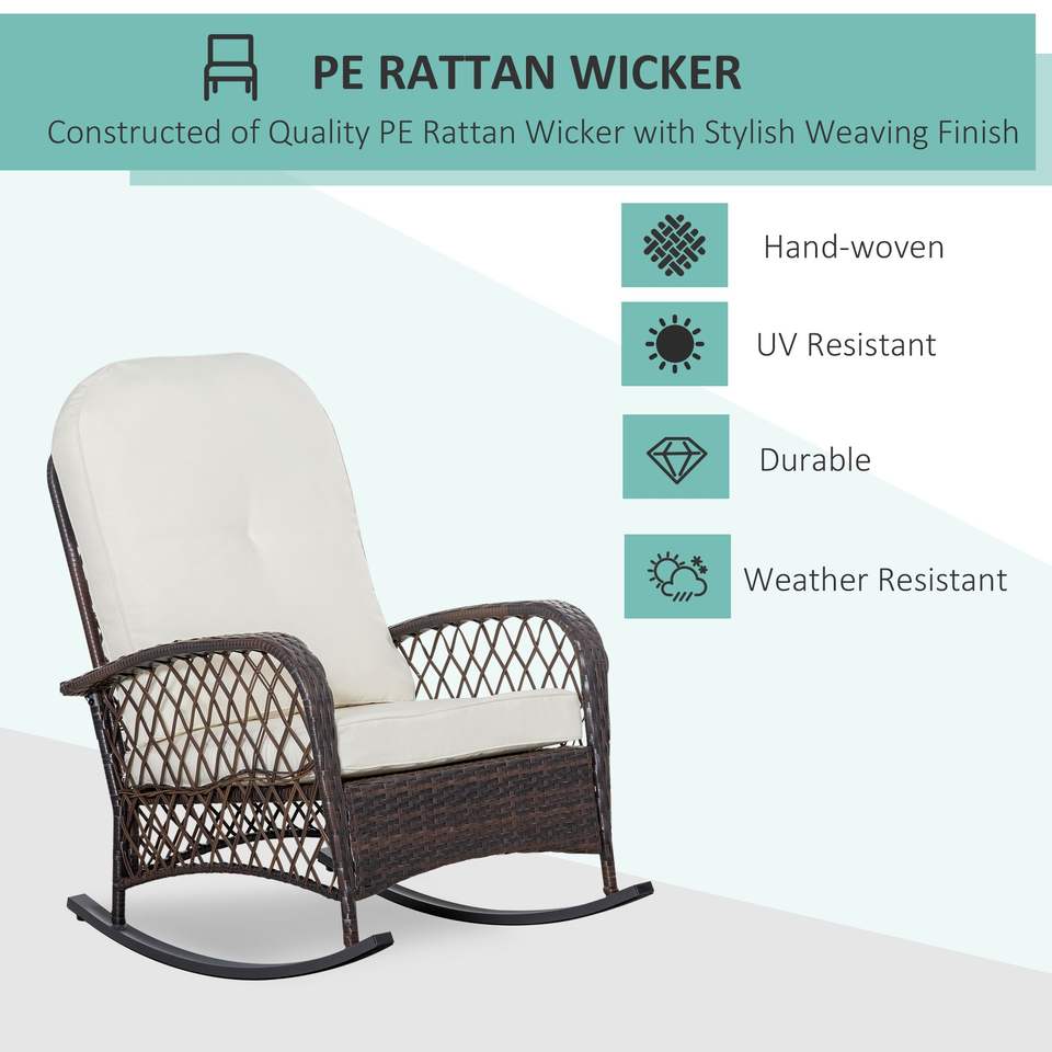 เก้าอี้โยกหวายกลางแจ้งสีครีมพร้อมที่นั่งกว้างและเบาะหนาเก้าอี้โยกสำหรับใช้ในสวน