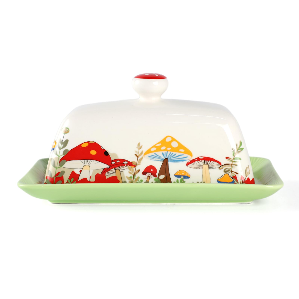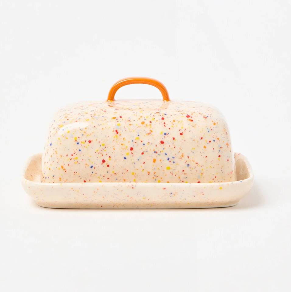 จานเนยครีมเซรามิกที่มีลวดลายเป็นจุดหลากสีและที่จับสีส้มมีเอกลักษณ์มีจำหน่ายในราคาขายส่ง
