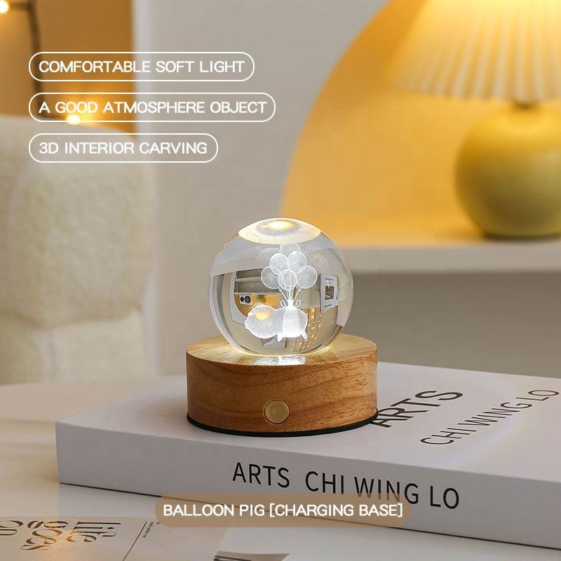 เลเซอร์3D สุดสร้างสรรค์ไฟ LED สำหรับยามค่ำคืนประดับด้วยแมงกะพรุนรูปปลาวาฬลูกบอลคริสตัลเรืองแสงฐานไม้สำหรับห้องนอนขนาด6ซม. สำหรับกลางคืน