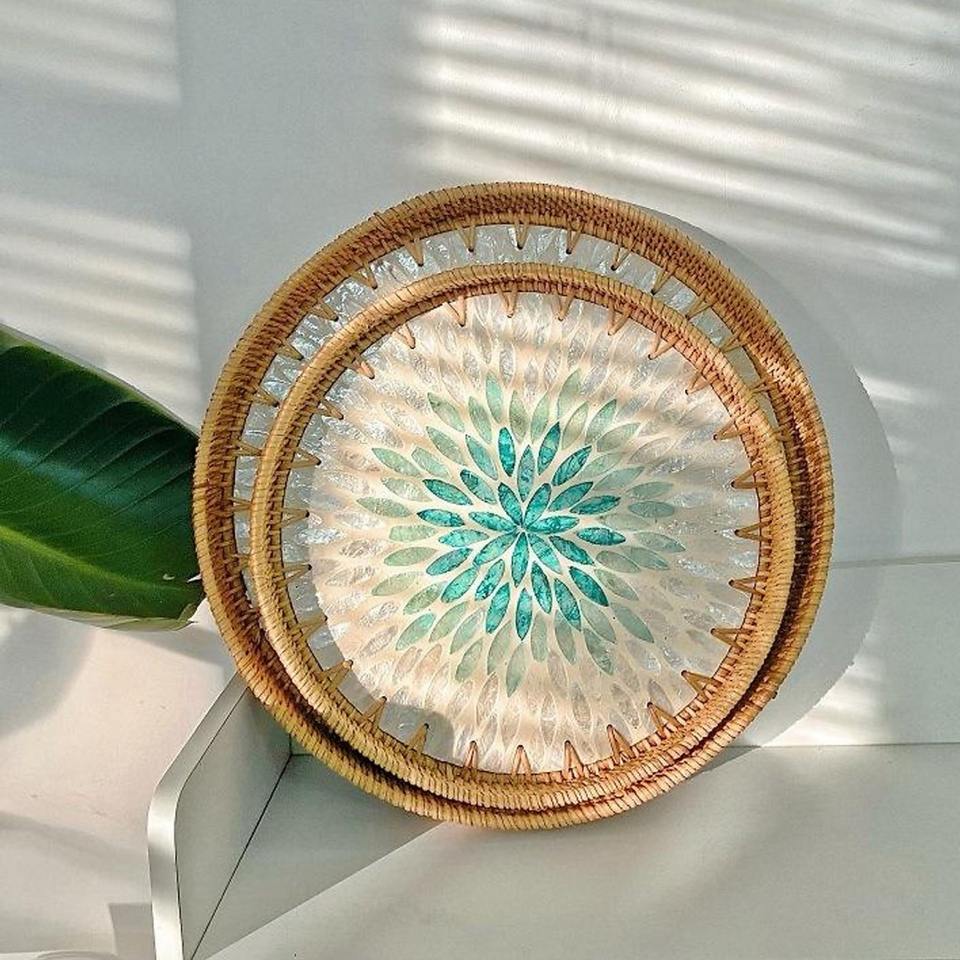 ถาดรองหวายทรงกลมศิลปะสุดสร้างสรรค์พร้อมแม่ของไข่มุกฝังในห้องครัวที่เป็นมิตรต่อสิ่งแวดล้อมจากเวียดนาม