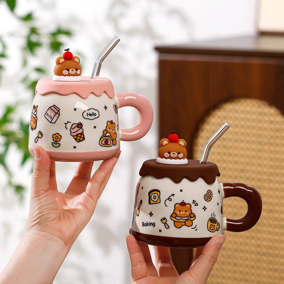 แก้วเซรามิคลายหมีสุดสร้างสรรค์ พร้อมฝาและหลอด สีชมพู-น้ำตาล ดีไซน์การ์ตูน สำหรับกาแฟ นม อาหารเช้า แก้วคู่รัก