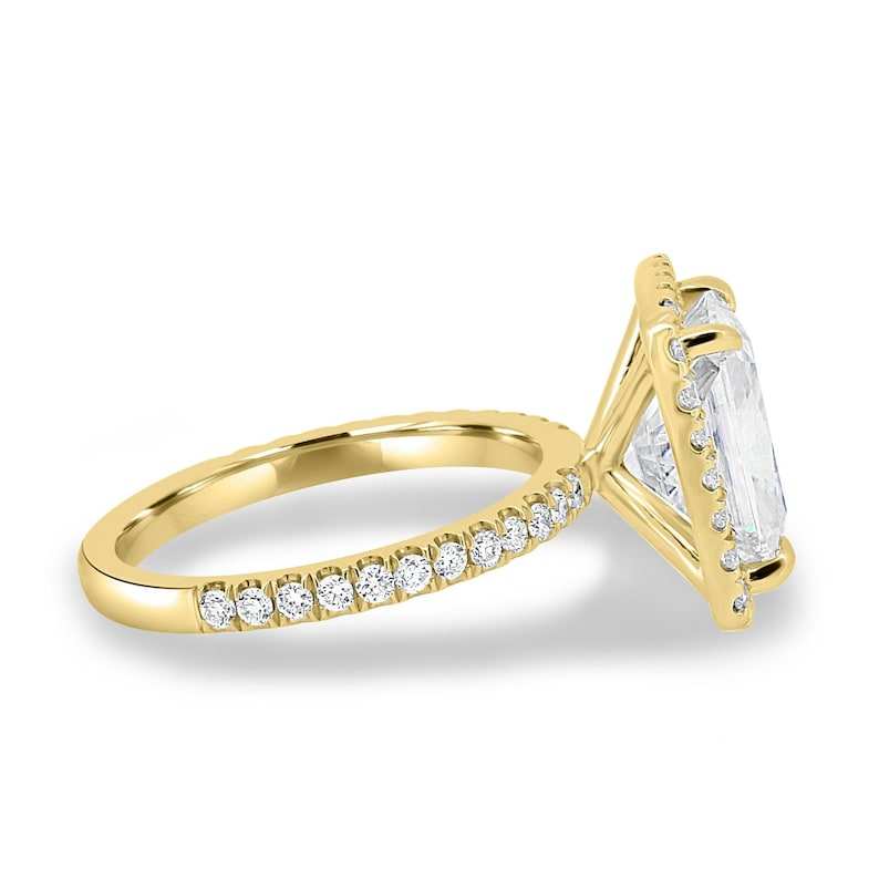 แหวนเพชรทรงรัศมี 4.00 กะรัต ผลิตในห้องปฏิบัติการ ประดับด้วยเพชรแบบ Halo ตัวเรือนทองคำขาว 14K ชุบทองคำเหลือง พร้อมวงแหวนแบบ Pav สำหรับหมั้นหมาย