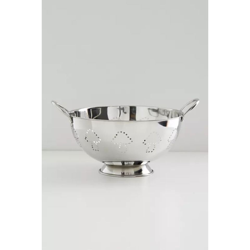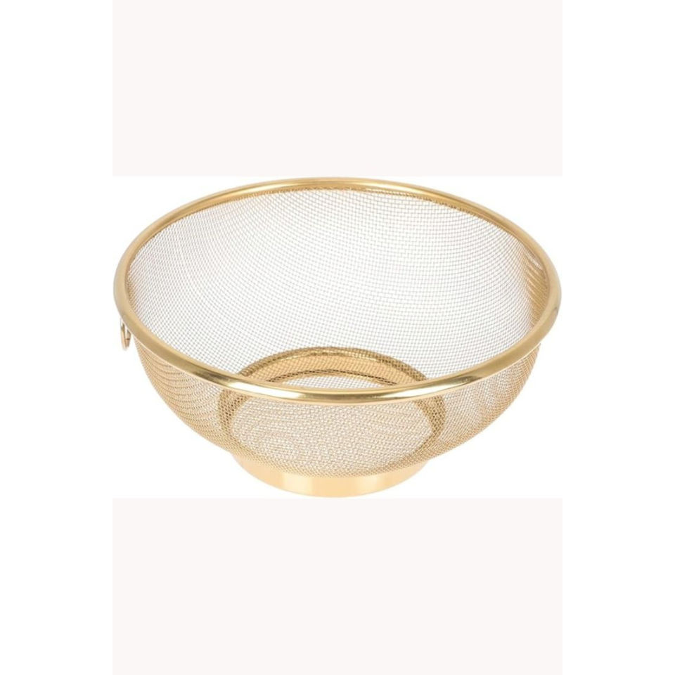 กระชอนสแตนเลสเคลือบทองแดงตกแต่งอย่างสวยงาม พร้อมหูจับทองเหลือง สำหรับกรองผลไม้และผัก