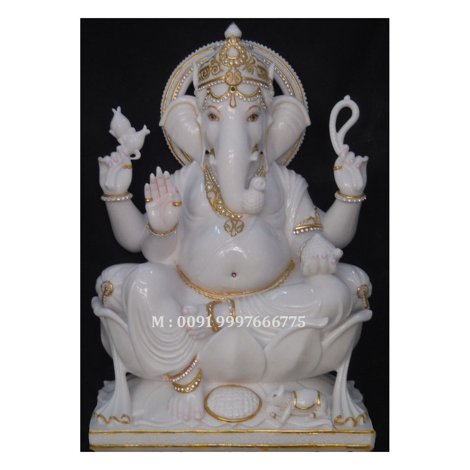 รูปปั้นพระพิฆเนศหินอ่อนสีขาวอินเดีย ดีไซน์สร้างสรรค์ พร้อมมืออวยพร นั่งบนดอกบัว สำหรับตกแต่งในเทศกาลและการบูชา