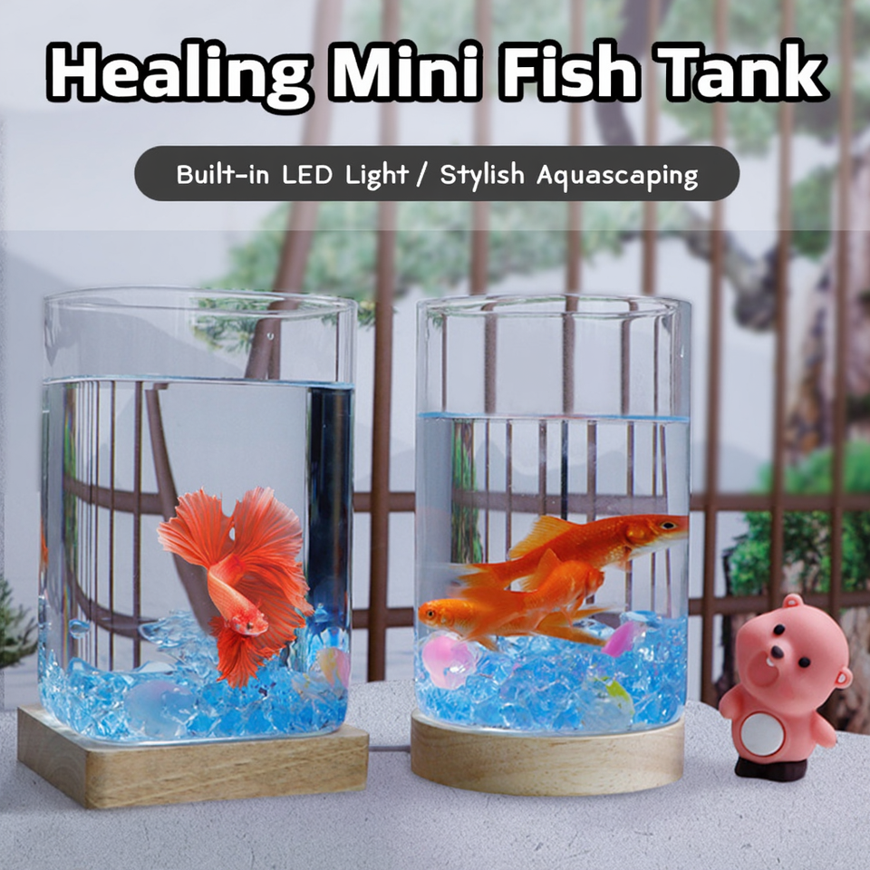 ตู้ปลาแก้วตั้งโต๊ะดีไซน์สร้างสรรค์ พร้อมไฟ LED ฐานตกแต่งคริสตัลน้ำแข็งมุก ชุดอุปกรณ์จัดตู้ปลาขนาดเล็กครบชุด