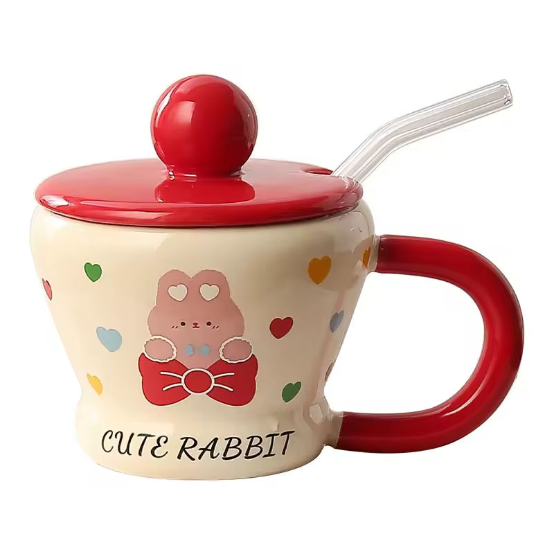 ถ้วยเซรามิกลายกระต่ายน่ารักมีฝาปิดที่สร้างสรรค์ถ้วยเซรามิกทนความร้อนจากกระดูกจีนสำหรับน้ำชากาแฟ