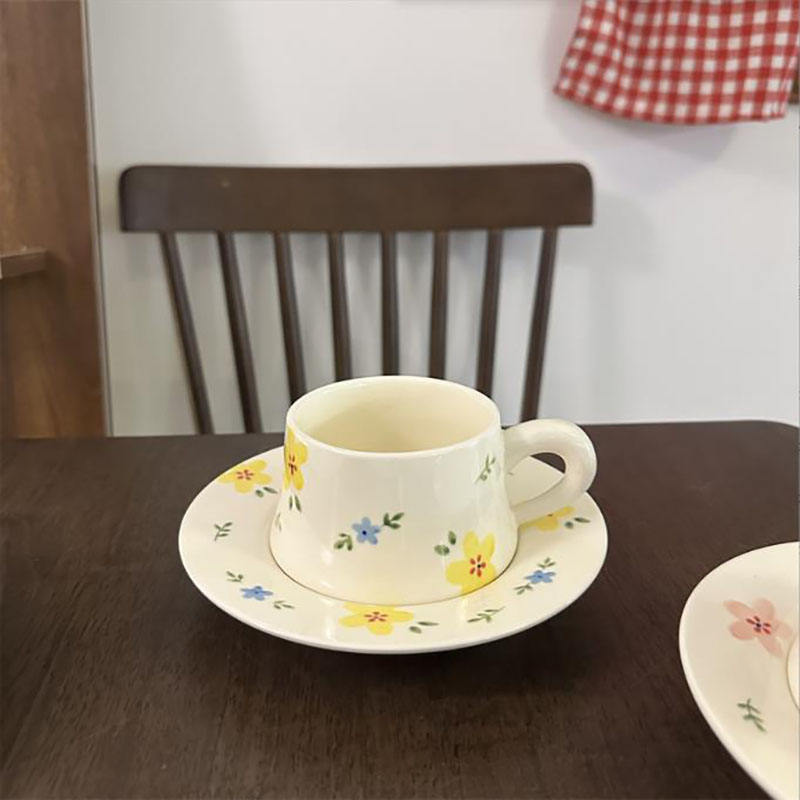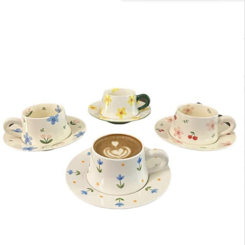แก้วมักเซรามิกสำหรับใส่ชาและจานสำหรับใส่น้ำชายามบ่ายลายดอกไม้สุดสร้างสรรค์ที่เรียบง่าย