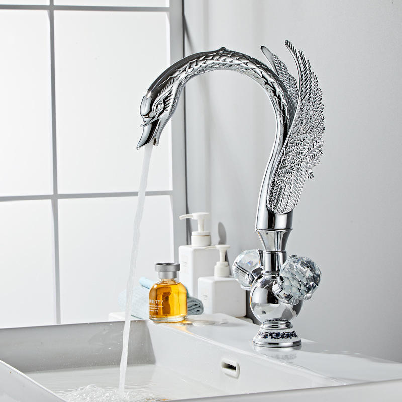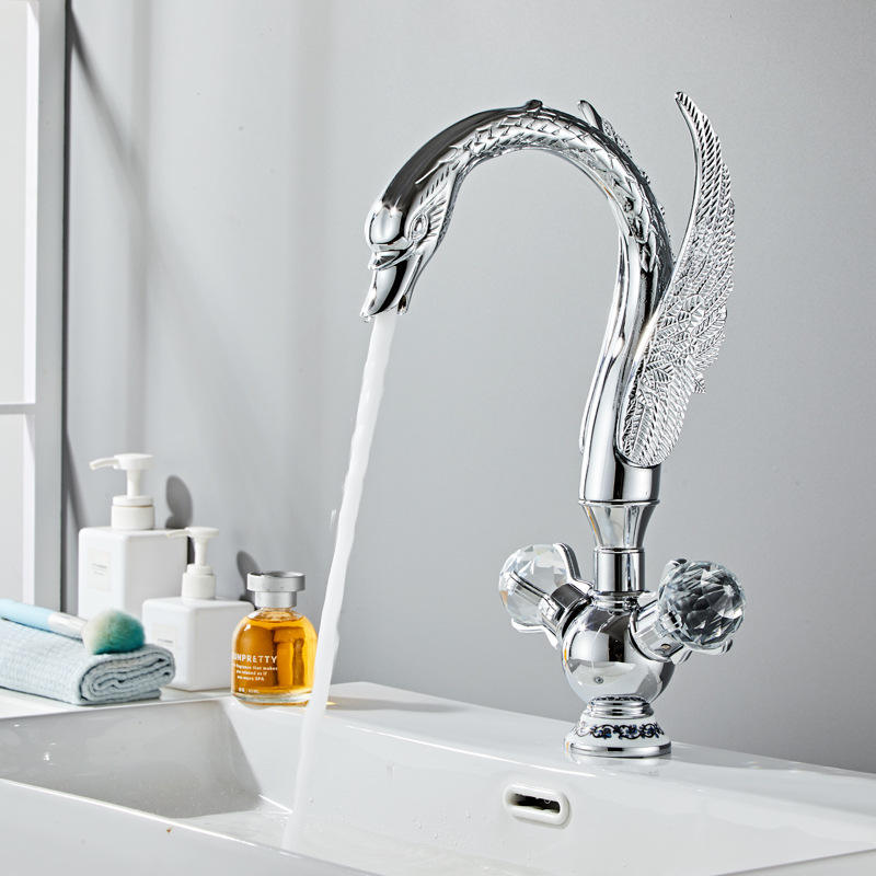 ก๊อกน้ำอ่างล้างหน้าแบบติดตั้งบนเคาน์เตอร์ ดีไซน์หงส์ทองเหลือง รูเดียว พร้อมก้านควบคุมคู่ ผิวขัดเงา วาล์วเซรามิก น้ำร้อน/น้ำเย็น