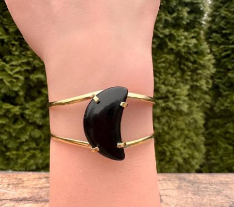 กำไลข้อมือรูปพระจันทร์เสี้ยวอัญมณีสองชั้นสีดำอัญมณีทรงหลังเบี้ยสร้อยข้อมือทรงเรขาคณิตชุบทอง18K
