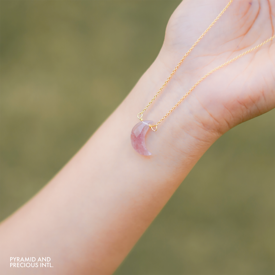 Crescent Moon Strawberry Quartz Gemstone Wire Wrap Charm Double Bail Pendant Necklace