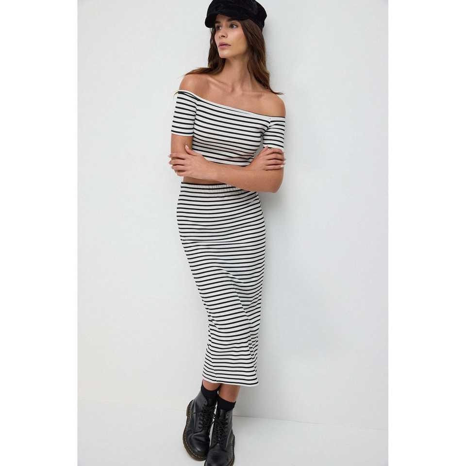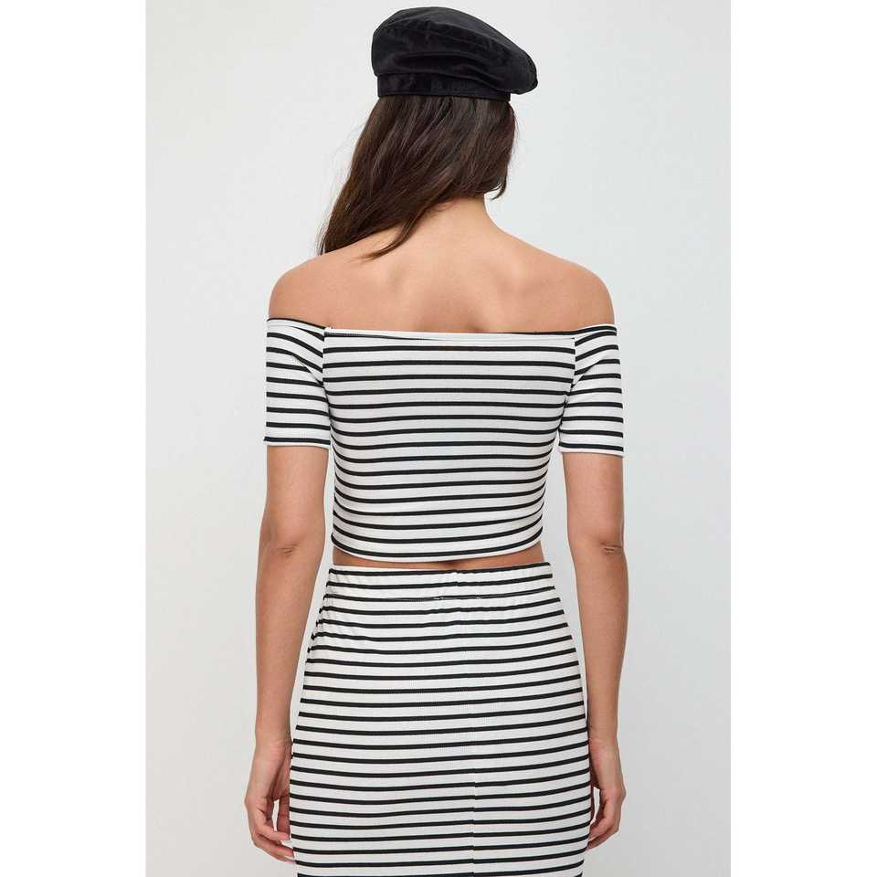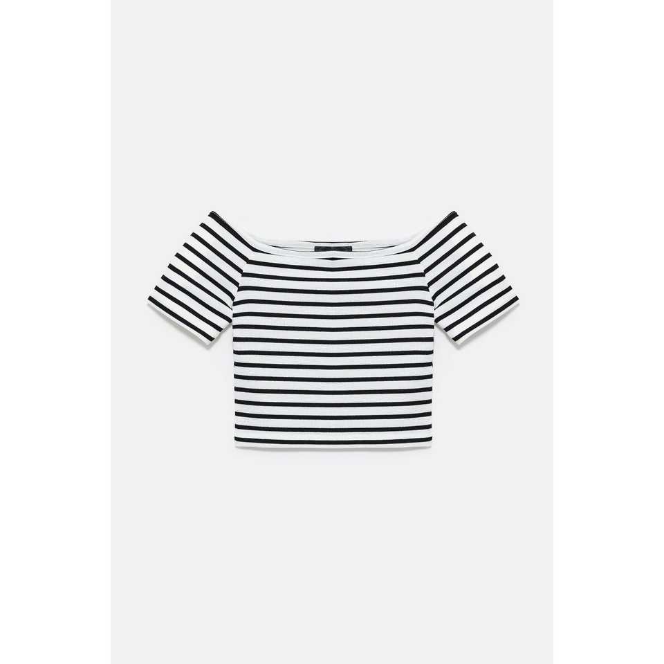 เสื้อครอปแขนสั้นลายทางลำลองคอกลม