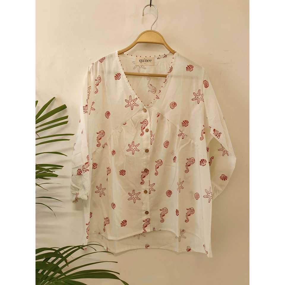 เสื้อผู้หญิงพิมพ์ลายมือสีแดงเข้มลายสมบัติใต้ทะเล ผ้าฝ้าย 100% ระบายอากาศได้ดี ตกแต่งกระดุม แขนสามส่วน