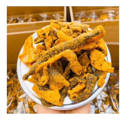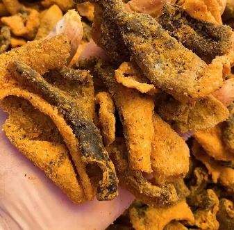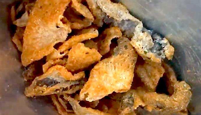 ผิวปลาสีเหลืองอำพันทอดกรอบพร้อมไข่รสอร่อยเนื้อกรุบกรอบและเครื่องเทศที่มีกลิ่นหอม