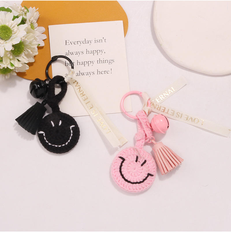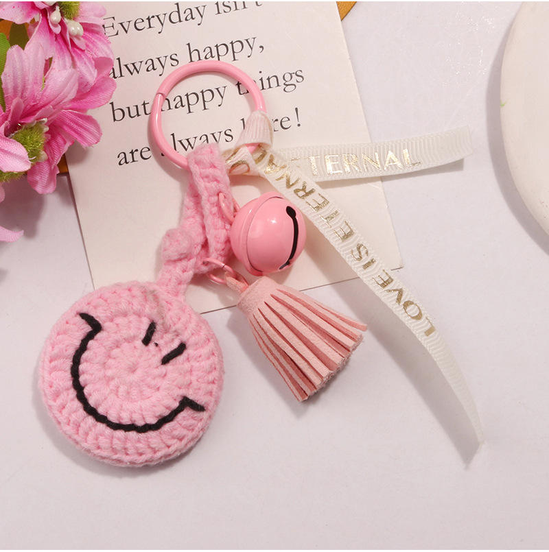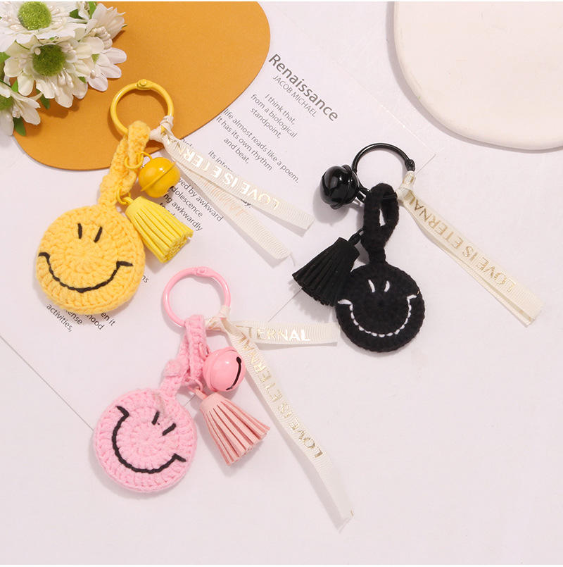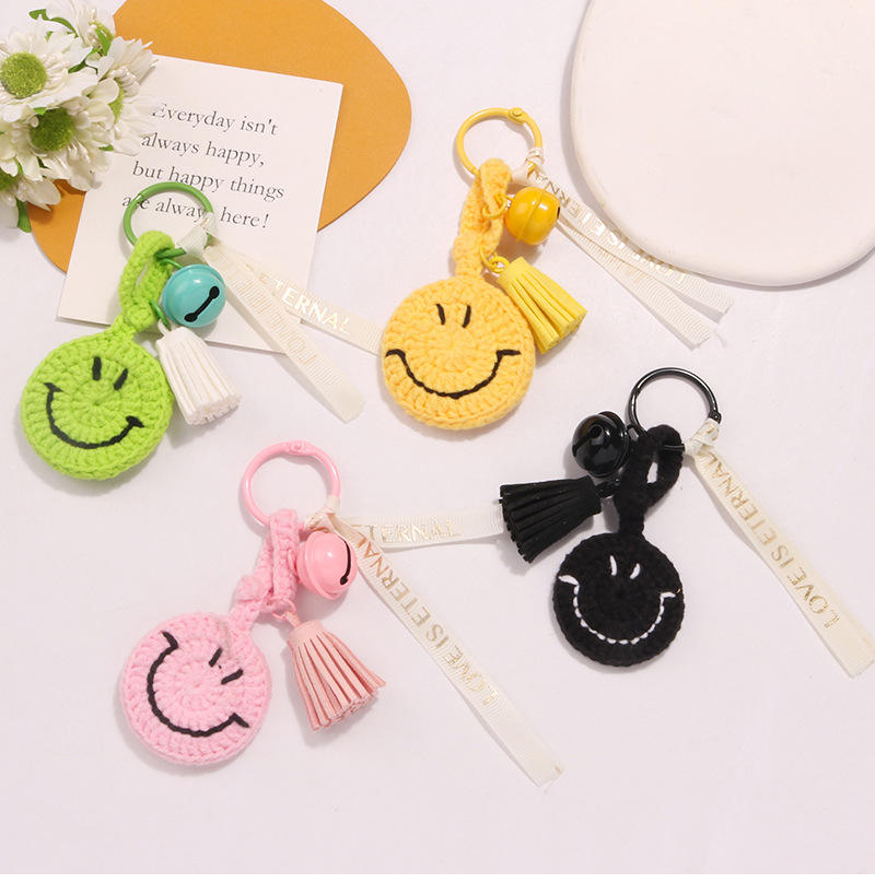 พวงกุญแจตุ๊กตาถักโครเชต์สไตล์โบโฮ ทำมือ ลายการ์ตูนน่ารัก พร้อมพู่ห้อย กระดิ่ง และจี้รูปหน้ายิ้ม KM