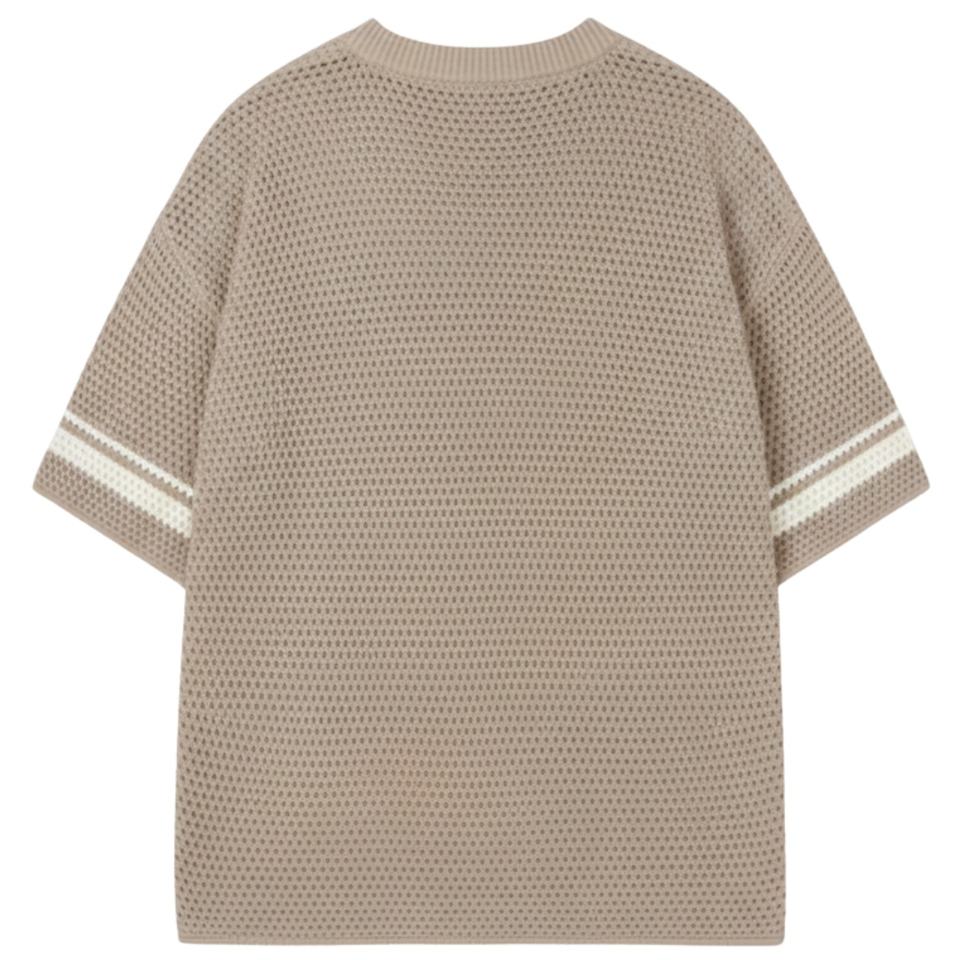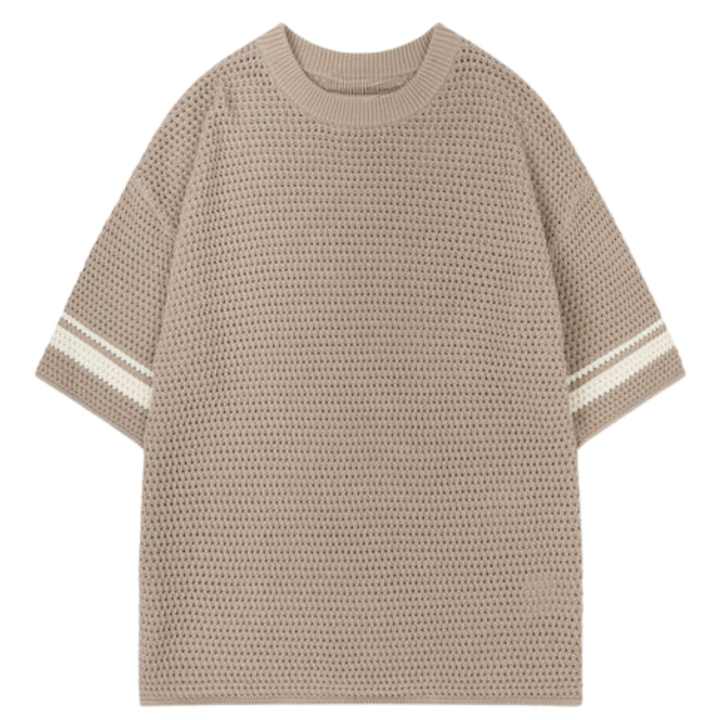 เสื้อยืดถักโครเชต์ลายทางตัดสีสัน แขนสั้น สีน้ำตาล เนื้อผ้าถักแบบมีเท็กซ์เจอร์ สวมใส่สบายๆ ในฤดูร้อน ระบายอากาศได้ดี คอกลม