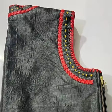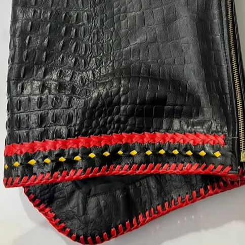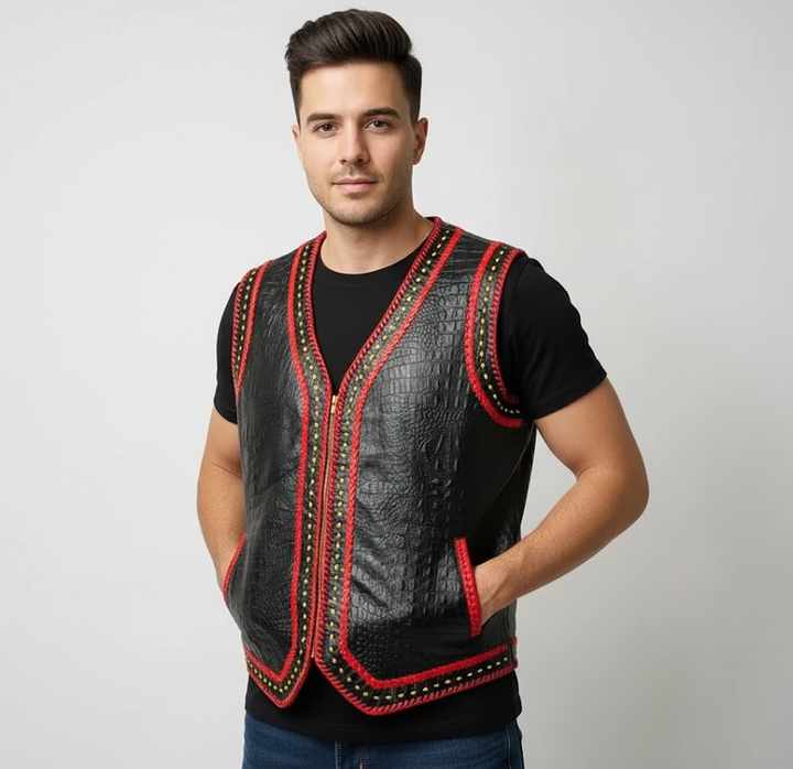 เสื้อกั๊กหนังลายจระเข้สีดำสำหรับนักขี่มอเตอร์ไซค์ พร้อมขอบถักสีแดงเหลือง ซิปด้านหน้าและกระเป๋า