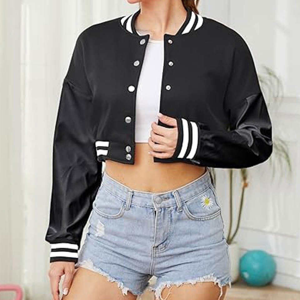 แจ็กเก็ตสั้นทรงสลิมฟิตสีดำสำหรับผู้หญิงแจ็คเก็ตวิทยาลัยเลตเตอร์แมนปักลายตามสั่ง