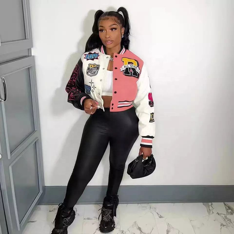 แจ็กเก็ตเลตเตอร์แมนของผู้หญิงเสื้อแจ็กเก็ตมีโลโก้ตามสั่ง