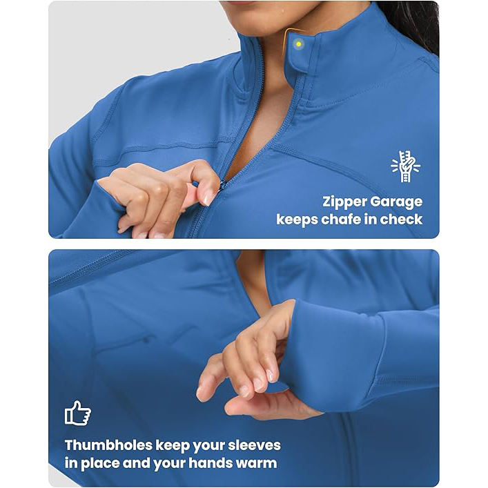 เสื้อแจ็คเก็ตโยคะแบบครอป ซิปเต็มตัว คอสูง มีรูสอดนิ้วโป้ง ทรงเข้ารูป ผลิตจากไนลอนผสมสแปนเด็กซ์ ยืดได้สี่ทิศทาง ระบายอากาศได้ดี แห้งเร็ว