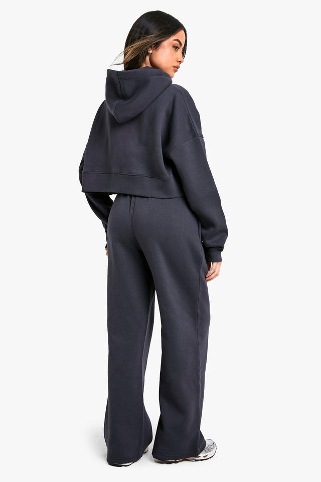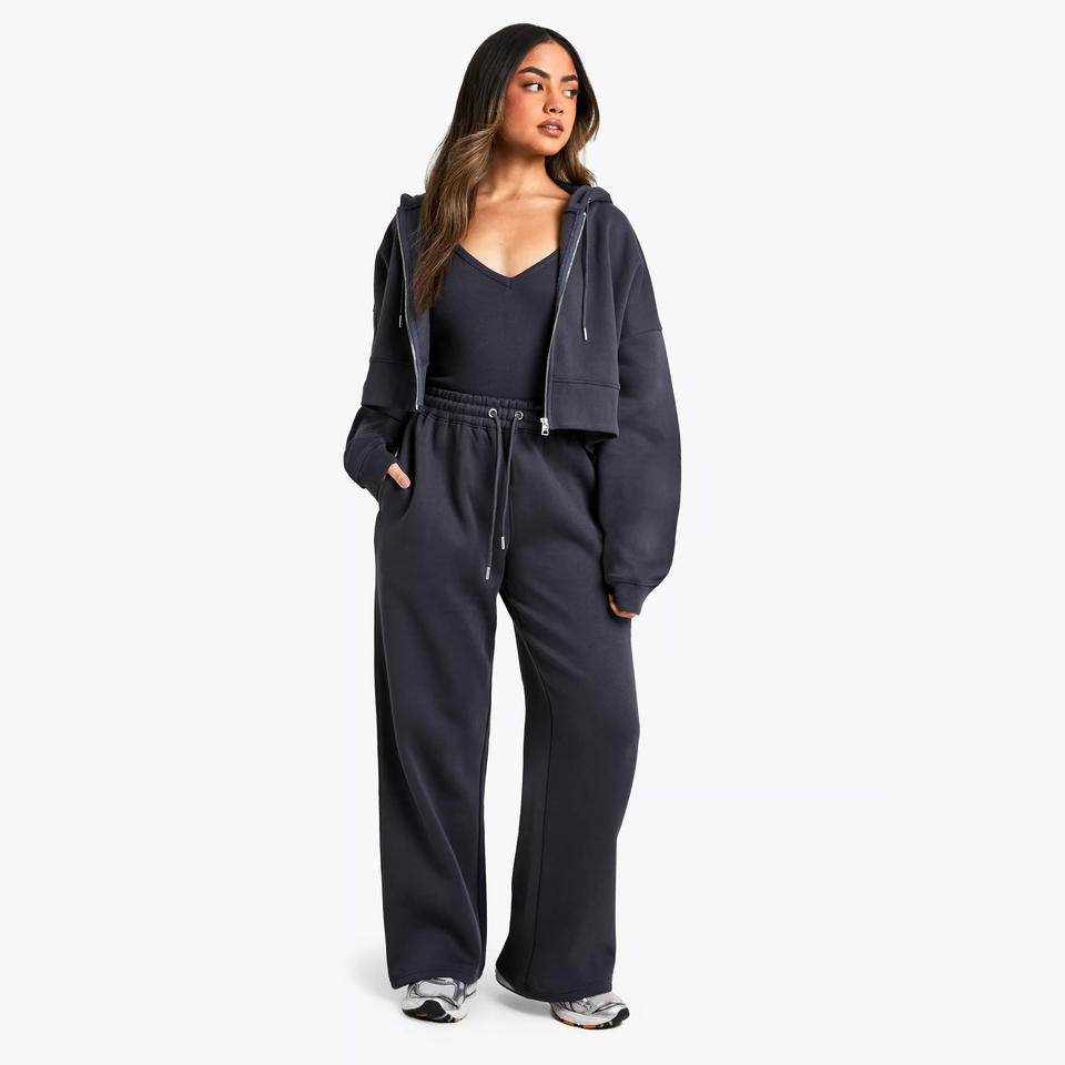 ชุดวิ่งแบบมีฮู้ดและขากว้างสำหรับผู้หญิงชุดกีฬาสองชิ้นสไตล์เรียบง่ายแนวสตรีทแบบสวมหัว