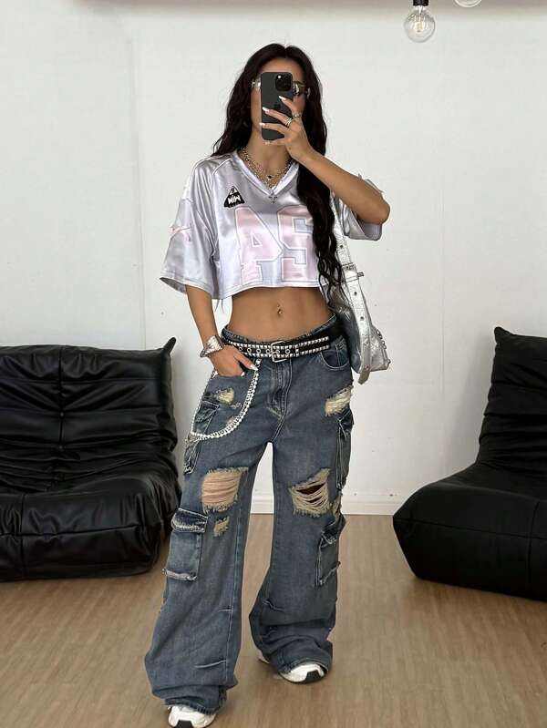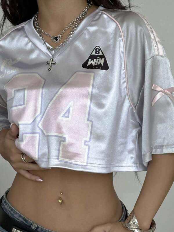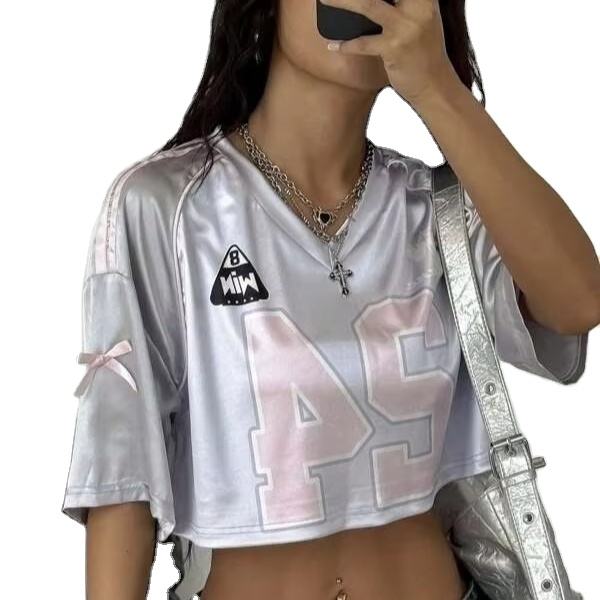 เสื้อฟุตบอลสไตล์อเมริกันผ้าซาตินรุ่นสั้นสำหรับผู้หญิงเสื้อแนวสตรีทเสื้อคอวีผ้าตาข่ายสีตัดกันเสื้อยืดเสื้อฟุตบอล
