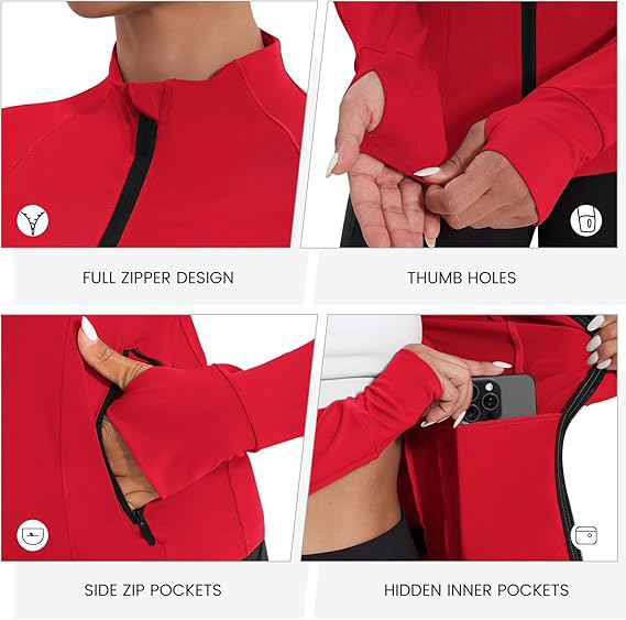 เสื้อแจ็คเก็ตโยคะแบบครอปซิปสำหรับผู้หญิง คอสูง มีรูสำหรับนิ้วโป้ง ทรงเข้ารูป ผลิตจากไนลอนผสมสแปนเด็กซ์ ยืดได้สี่ทิศทาง แห้งเร็ว
