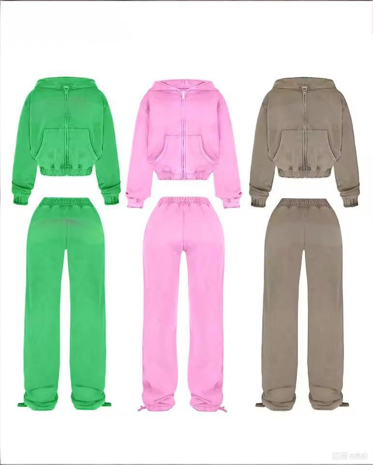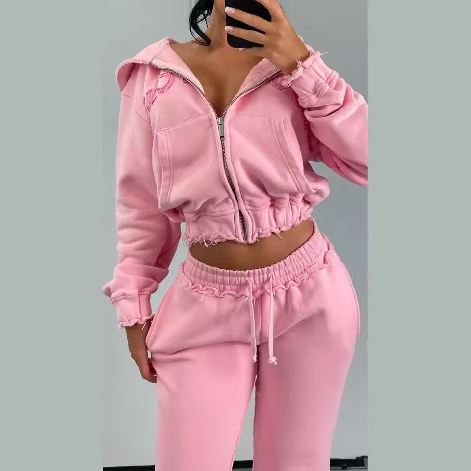 ชุดเซ็ตฮู้ดดี้ซิปแบบครอป กางเกงวอร์มขายาว ชุดวอร์มสั่งทำพิเศษ ชุดวอร์มสไตล์วินเทจปักลายขาดๆ ชุดจ็อกเกอร์สตรีทแวร์ ชุดวอร์มผู้หญิง