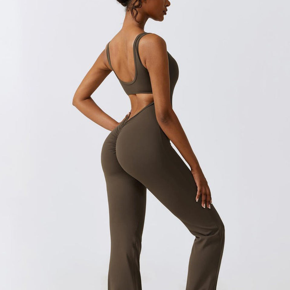 จั๊มสูทโยคะแบบไขว้หลัง ชุดออกกำลังกายผู้หญิง สปอร์ตแวร์ลำลอง กางเกงขาบานรัดสะโพก ชุดออกกำลังกายสำหรับผู้หญิง