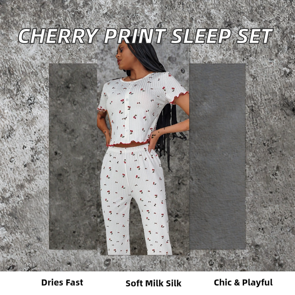 ชุดนอนผู้หญิงผ้าบางลายเชอร์รี่พิมพ์ลายใหม่ แต่งระบายขอบเอวยางยืด แขนสั้น กางเกงขาสั้น สำหรับฤดูร้อน เหมาะสำหรับการค้าต่างประเทศข้ามพรมแดน