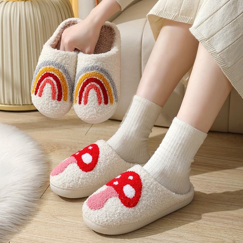 รองเท้าแตะขนนุ่มสำหรับใส่ในบ้านและนอกบ้าน ลายหัวใจสีพีช ผ้าฝ้ายกำมะหยี่สีรุ้ง สำหรับผู้หญิง เหมาะสำหรับฤดูหนาว