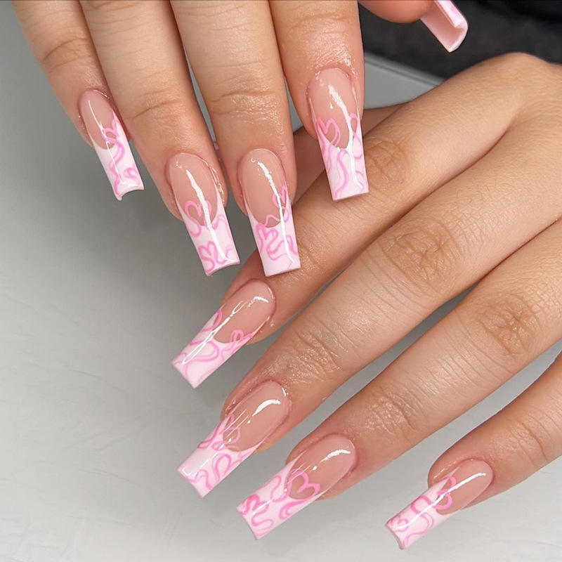 เล็บยาวแบบสวมใส่ได้ข้ามพรมแดนสติกเกอร์รูปหัวใจสีชมพูน่ารัก24ชิ้นปลายเล็บขายส่งกาวเจลลี่