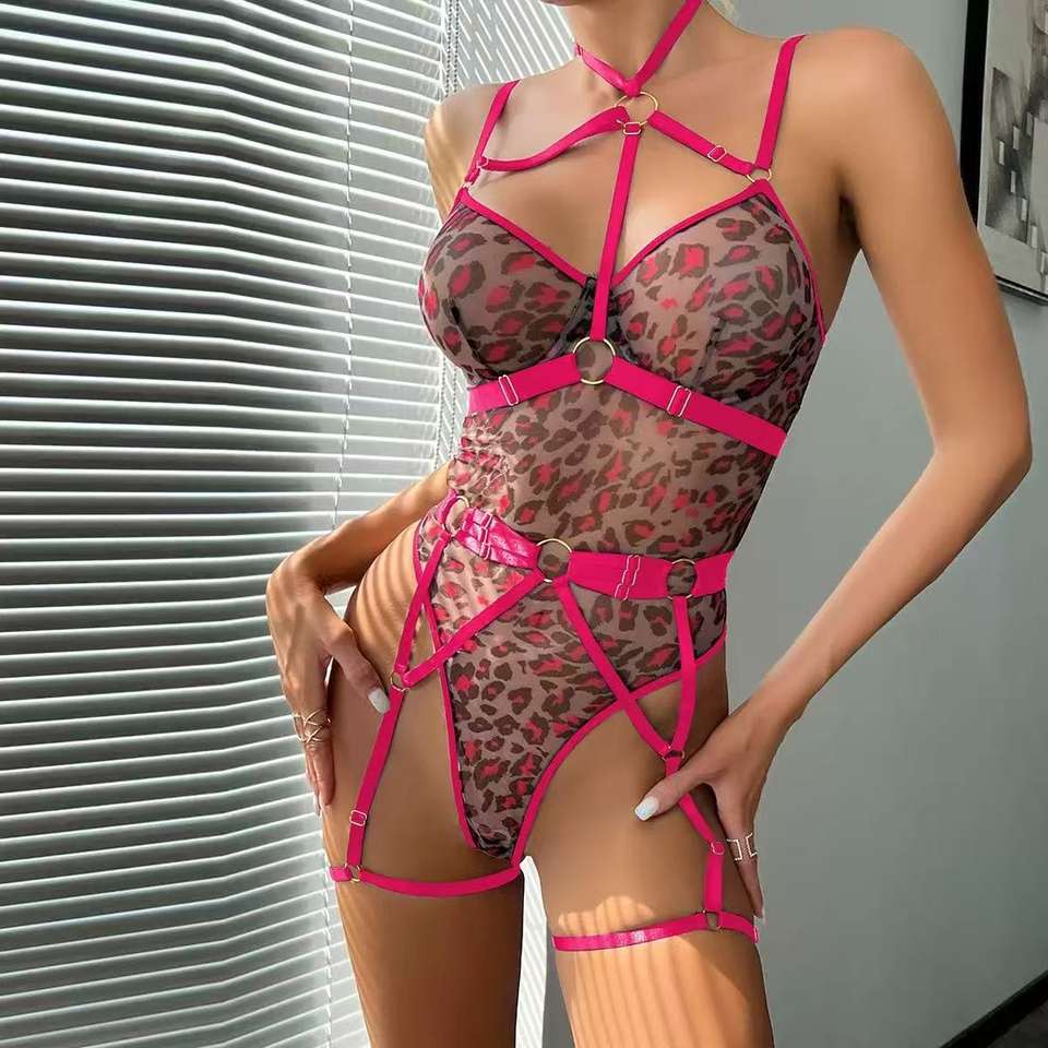 บอดี้สูทสไตล์ยุโรปอเมริกันแบบใหม่ ไซส์ใหญ่ ลายเสือดาว ผ้าตาข่ายซีทรู สายรัด ชุดชั้นในเซ็กซี่ กระชับสัดส่วน