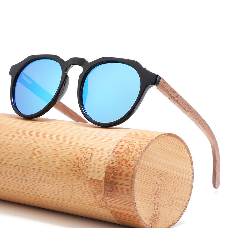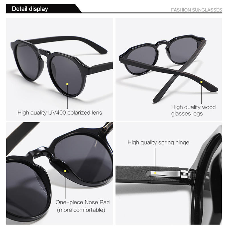 แว่นกันแดดไม้ไผ่โพลาไรซ์ทรงกลมเล็กสำหรับผู้หญิง ป้องกันรังสียูวี 400 เลนส์ TAC สีดำ แฟชั่นสำหรับการเดินทาง ป้องกันแสงแดด