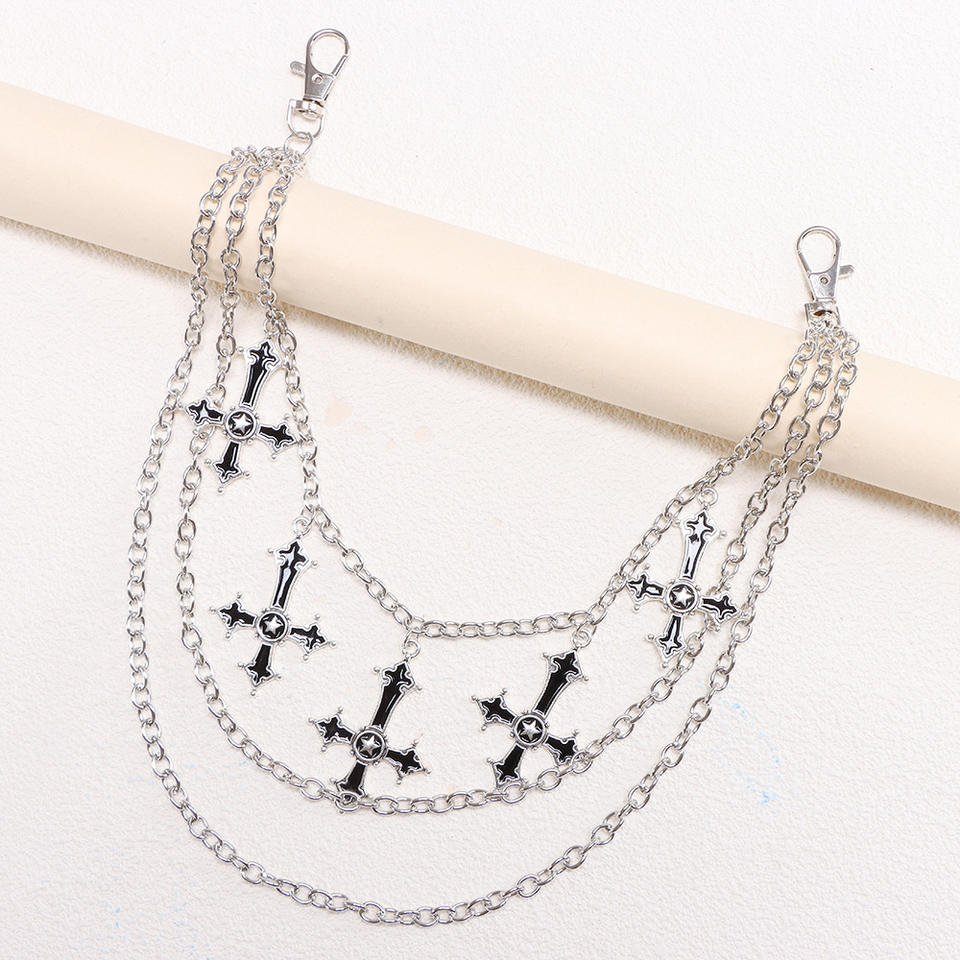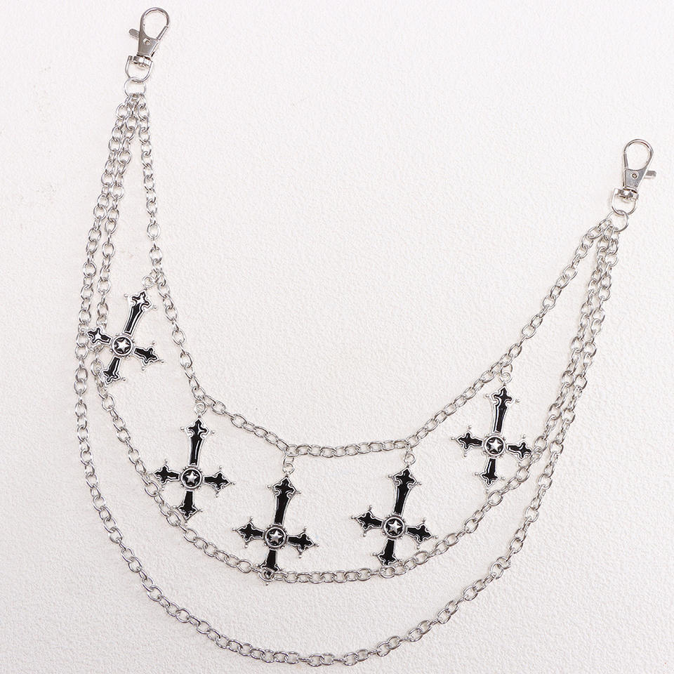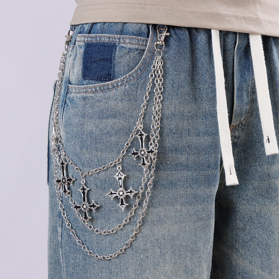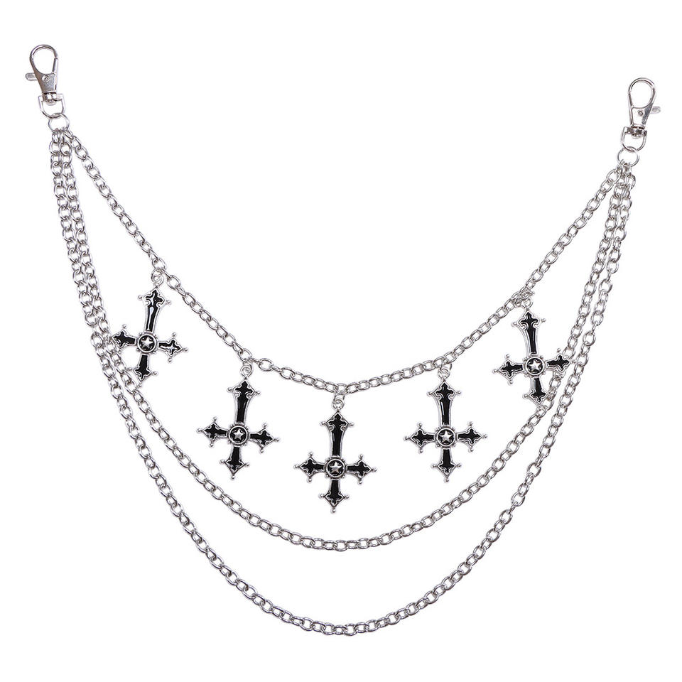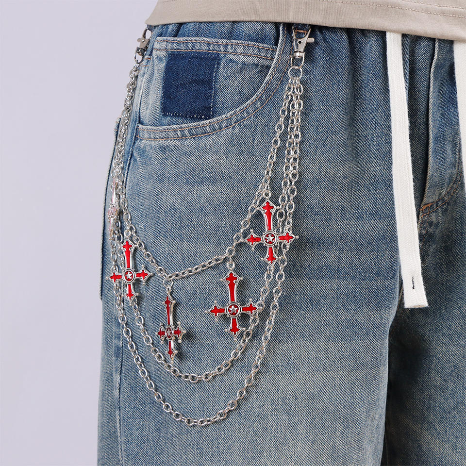 โซ่คาดเอวโลหะผสมสังกะสีหลายชั้น สไตล์ฮิปฮอป สำหรับกางเกงลำลอง พร้อมจี้รูปกางเขนกลับด้านสีแดง