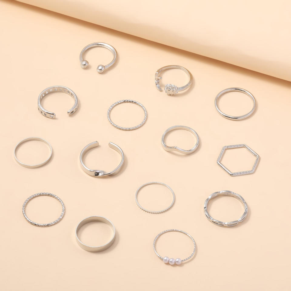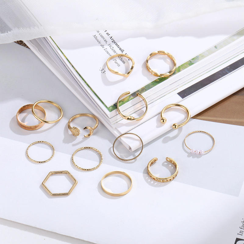แหวนมุกอัลลอยด์ลายพระอาทิตย์พระจันทร์แบบเปิด ดีไซน์เรียบง่าย ชุด 14 ชิ้น สำหรับผู้หญิง สินค้าขายดีข้ามพรมแดน เหมาะสำหรับเป็นของหมั้น