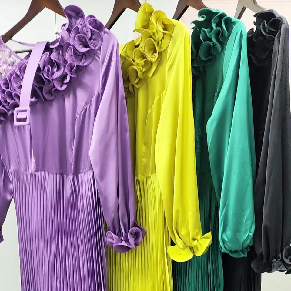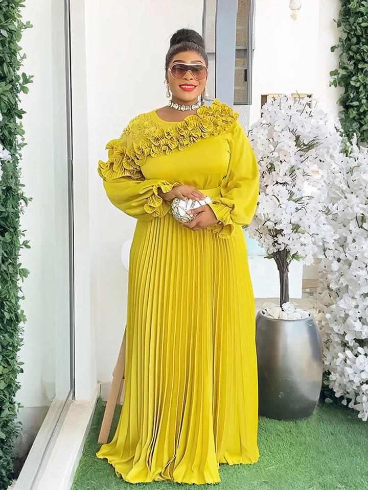 เดรสยาวผ้าซาตินสำหรับผู้หญิงกระโปรงจีบลายดอกไม้กระโปรงเอวเอ็มไพร์เอวใหญ่แบบทางการ