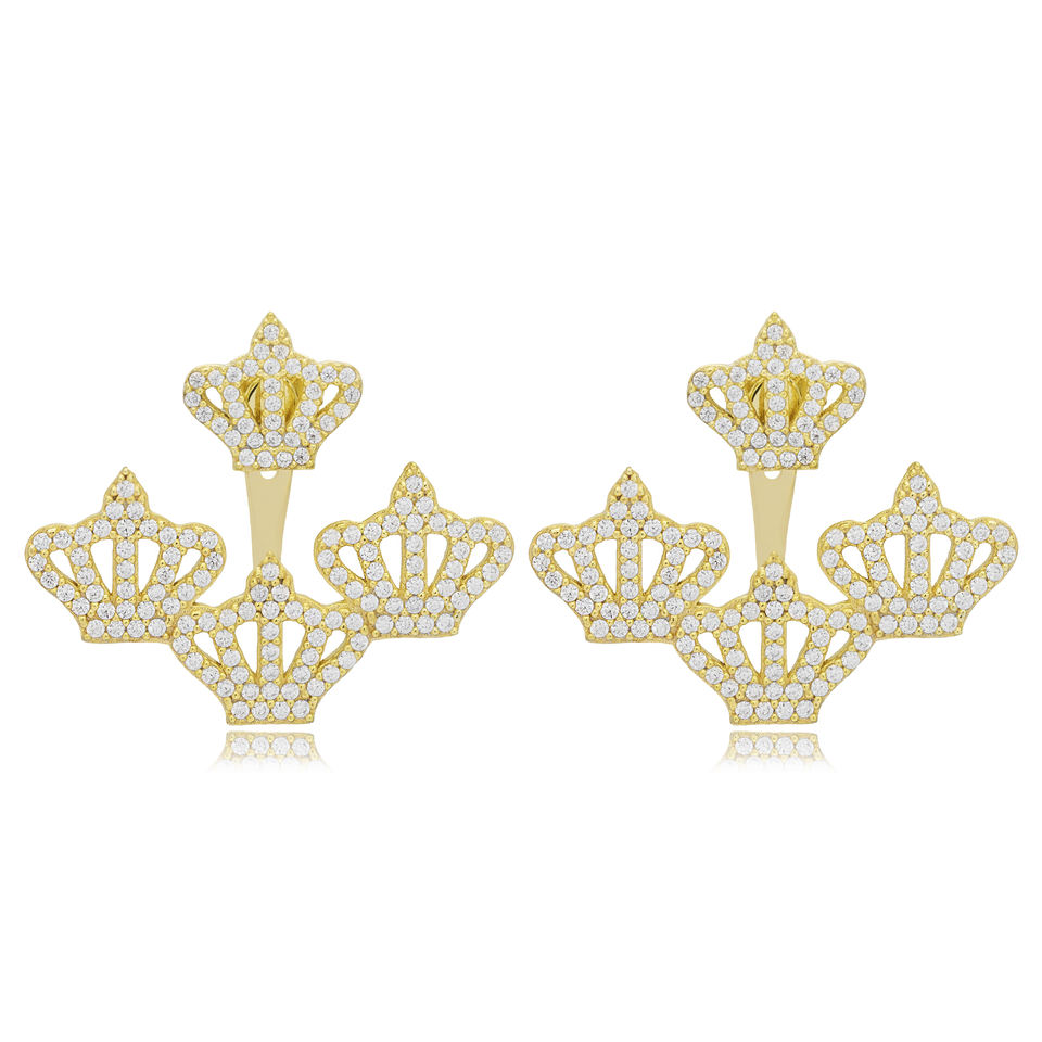 แจ็คเก็ตหูหินเพทายสีขาวดีไซน์มงกุฎต่างหูผู้หญิงต่างหูแฮนด์เมดแบบเรขาคณิตของตุรกีเครื่องประดับเงินสเตอร์ลิง925