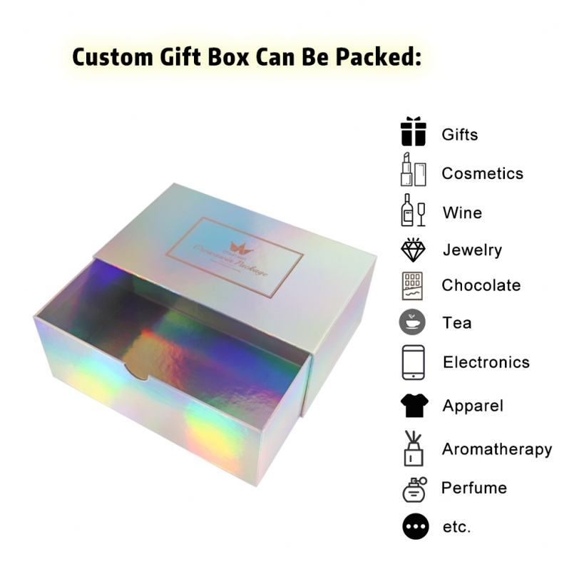ชุดของขวัญแบบลิ้นชักแข็งแบบเลื่อนได้ ปั๊มลายทองคำเปลว พร้อมซับในฟองน้ำ UV แบบกำหนดเองได้ ขายส่ง แบบพับเก็บได้ แบบหายตัวได้