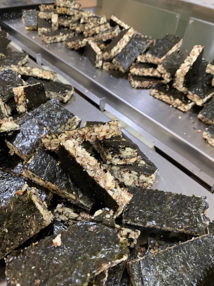 วัสดุ:สาหร่ายเกาหลี, ข้าวกล้อง, อัลมอนด์หั่นบางๆ, เมล็ด pumkin, เม็ดมะม่วงหิมพานต์