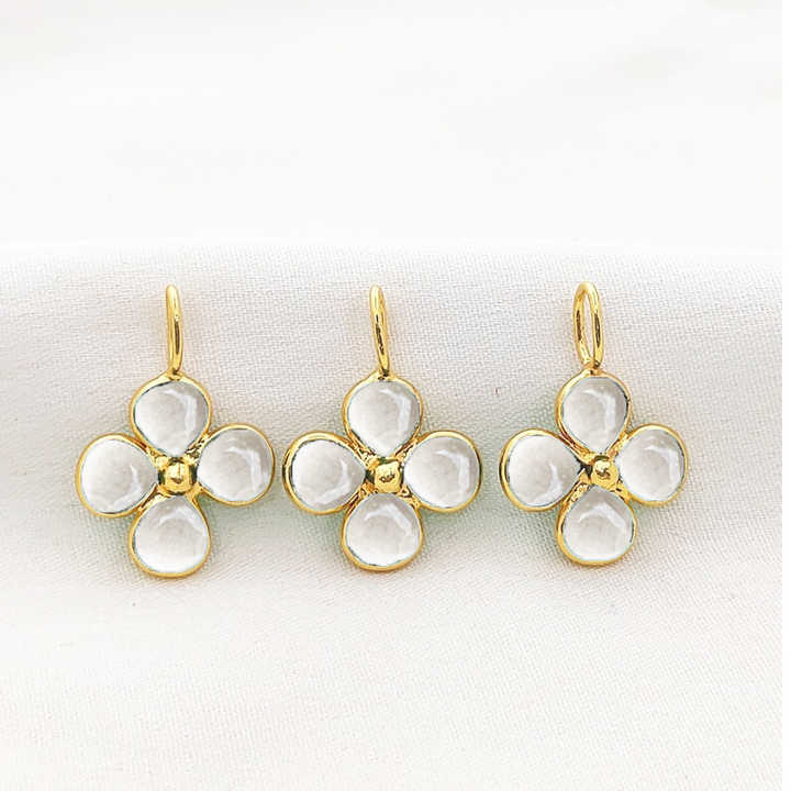 จี้รูปใบโคลเวอร์คริสตัลควอตซ์ใส ขนาด 5 มม. ขอบใบโคลเวอร์เรียบ งานแฮนด์เมด พร้อมห่วงขนาด 7 มม. ชุบทอง ประดับด้วยคริสตัลควอตซ์ใส